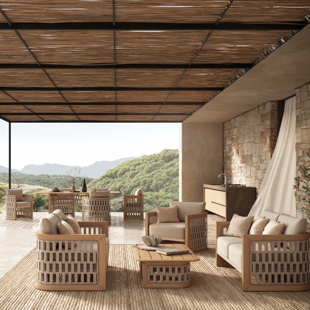 Our N2 coffee table in light teak combines intricately carved teak frame with hand woven panels, adding both texture and transparency to its silhouette. This coffee table features a spacious tabletop and a gracefully curved leg design, providing both functionality and elegance. The hand-woven breathable rope panels add a contemporary touch, creating the modern day rattan aesthetic that effortlessly enhances any space. This combination of craftsmanship and timeless design makes it a standout piece for both indoor and outdoor settings.