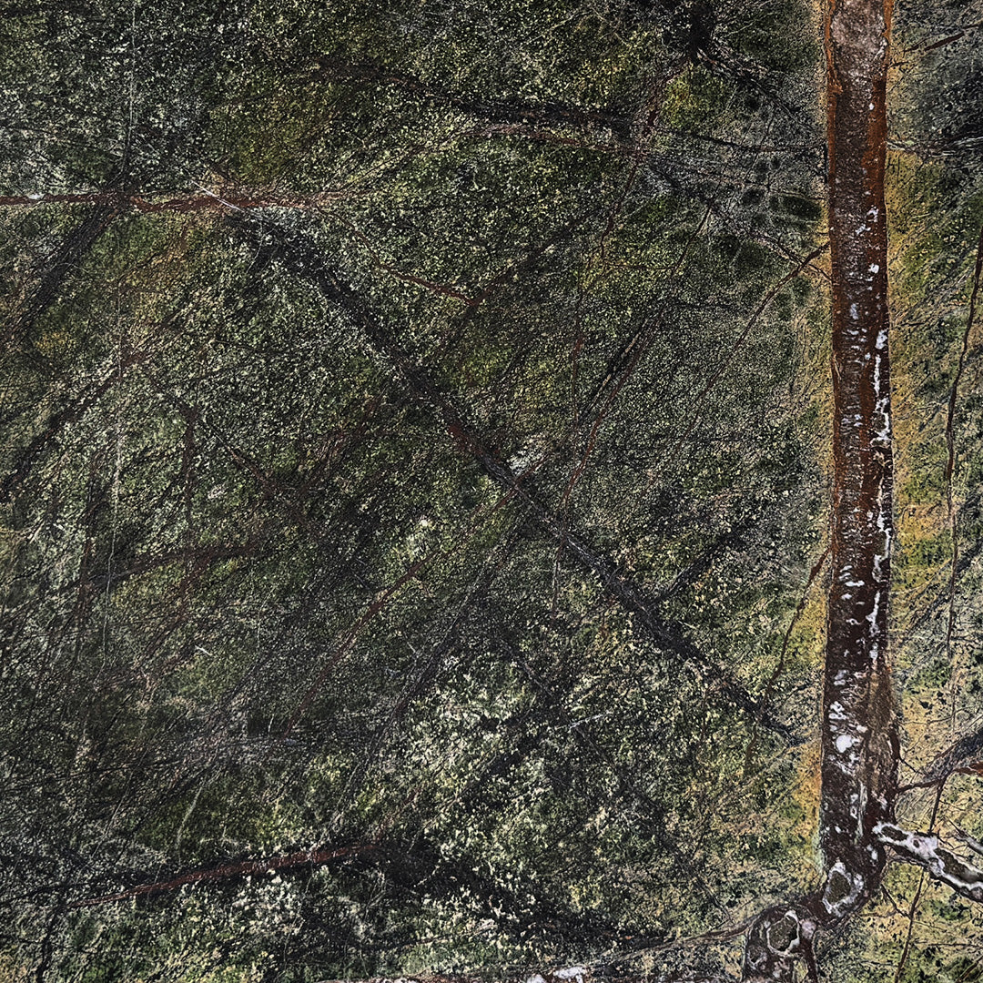 Forest Green marble is characterised by its rich, earthy hues and striking veining. The predominant shade is a deep, mossy green, accented with intricate patterns of lighter green and white, creating a textured appearance that evokes the look of a lush forest. Prominent veins of reddish-brown and dark grey traverse the surface, adding contrast and visual depth to the stone. The interplay of these colours and patterns gives the marble a dynamic, natural aesthetic, reminiscent of a dense forest canopy with interwoven branches and foliage. A polished finish enhances the depth and richness of the colours, as well as the intricate veining.